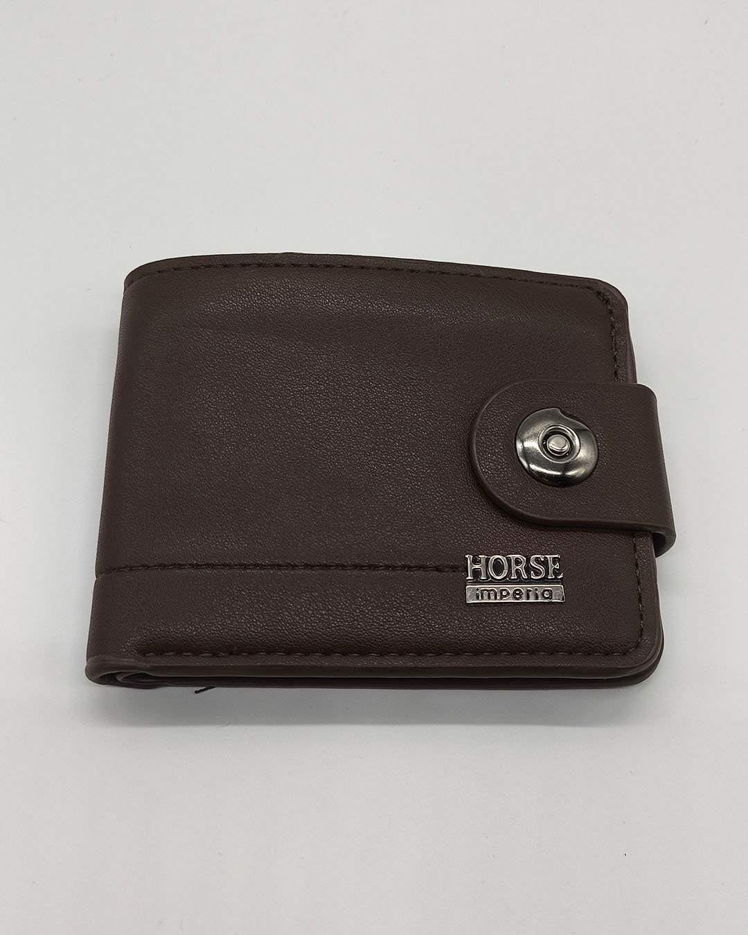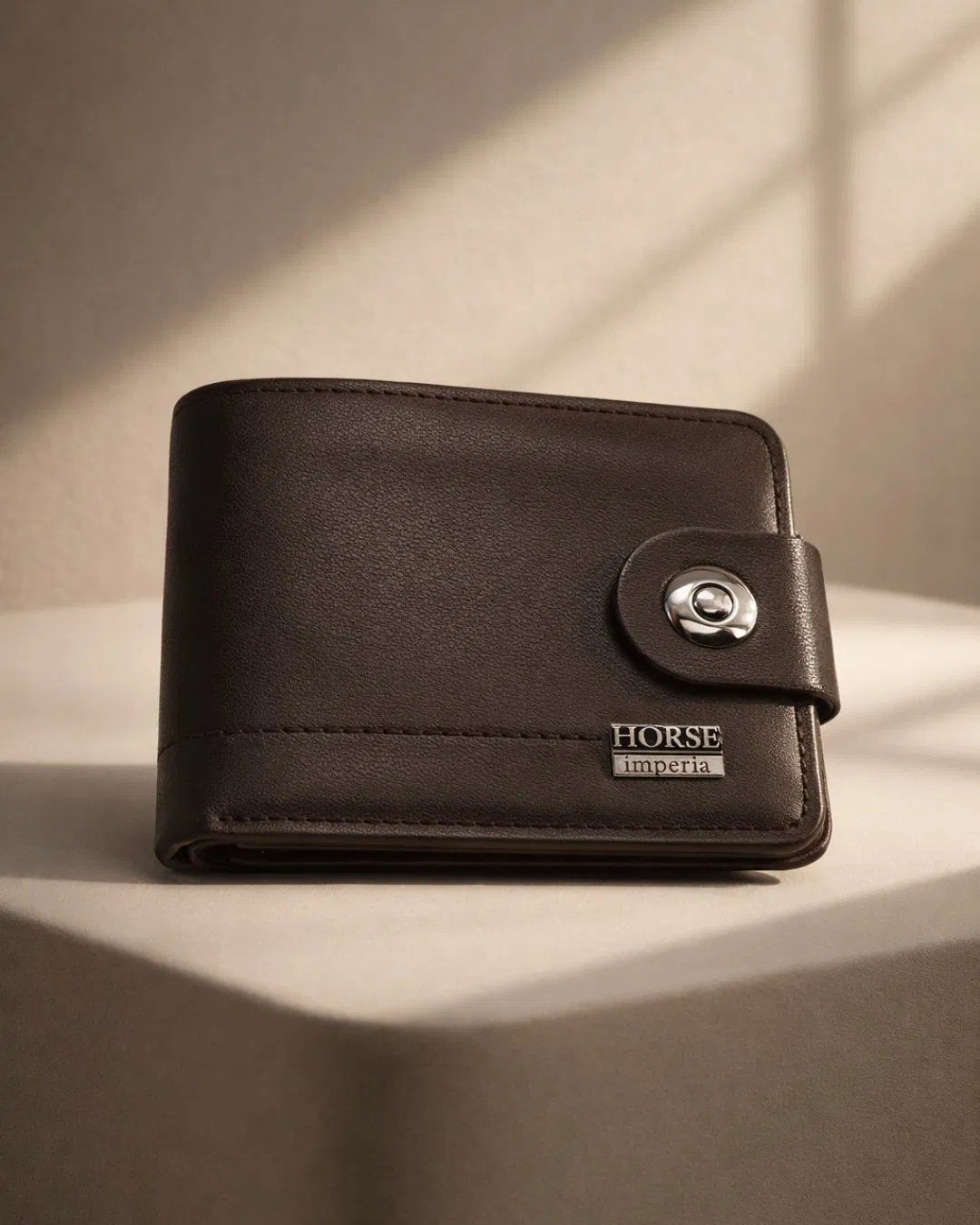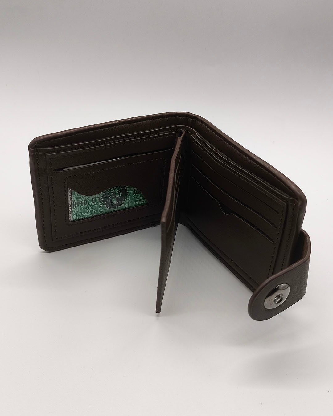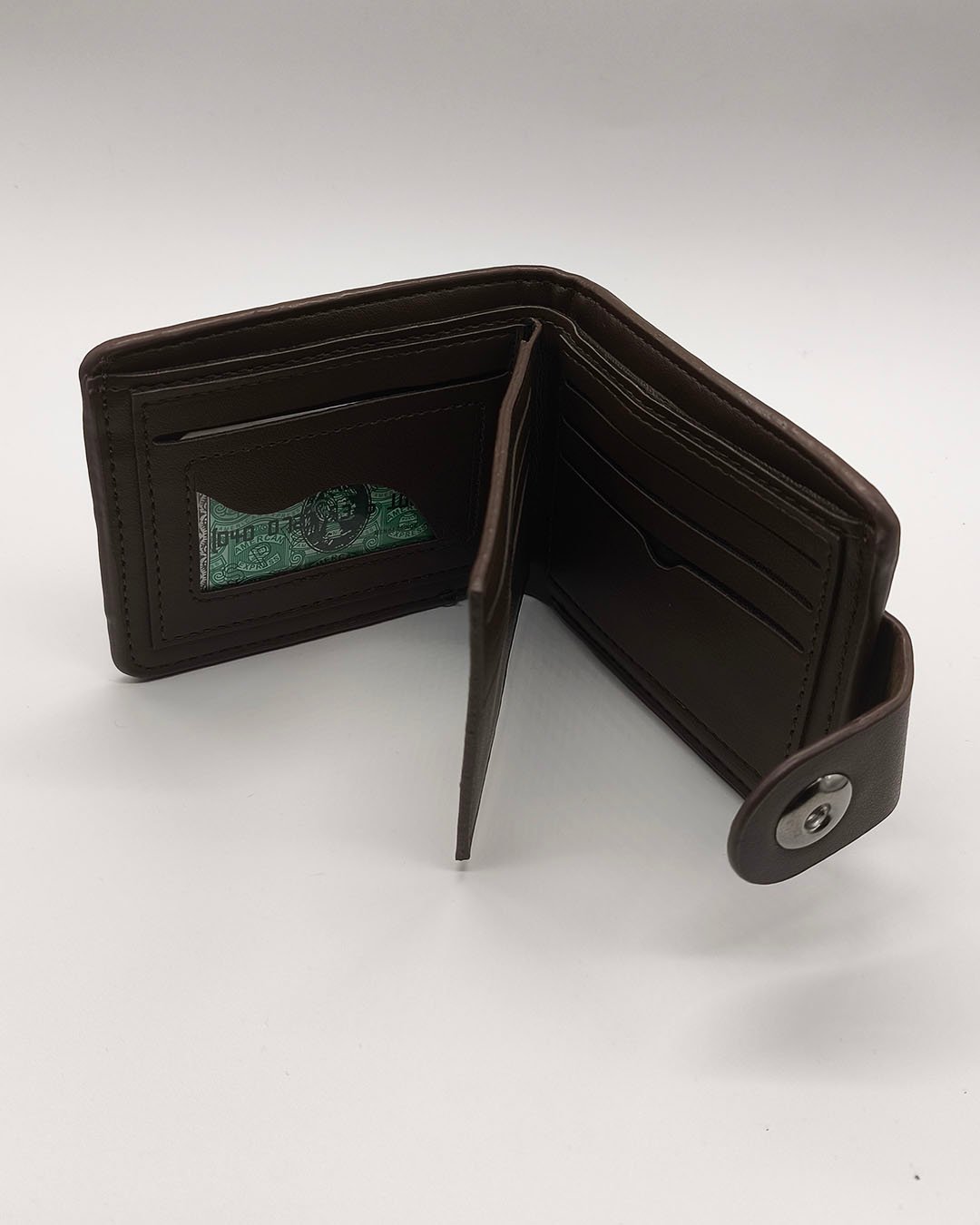 Esta billetera de cuero marrón ofrece un diseño clásico y sofisticado. Cuenta con cierre metálico de botón, ideal para mantener tus pertenencias seguras. Perfecta para quienes buscan durabilidad y estilo en un solo accesorio. Espacio suficiente para billetes y tarjetas. ¡Un imprescindible para tu día a día!