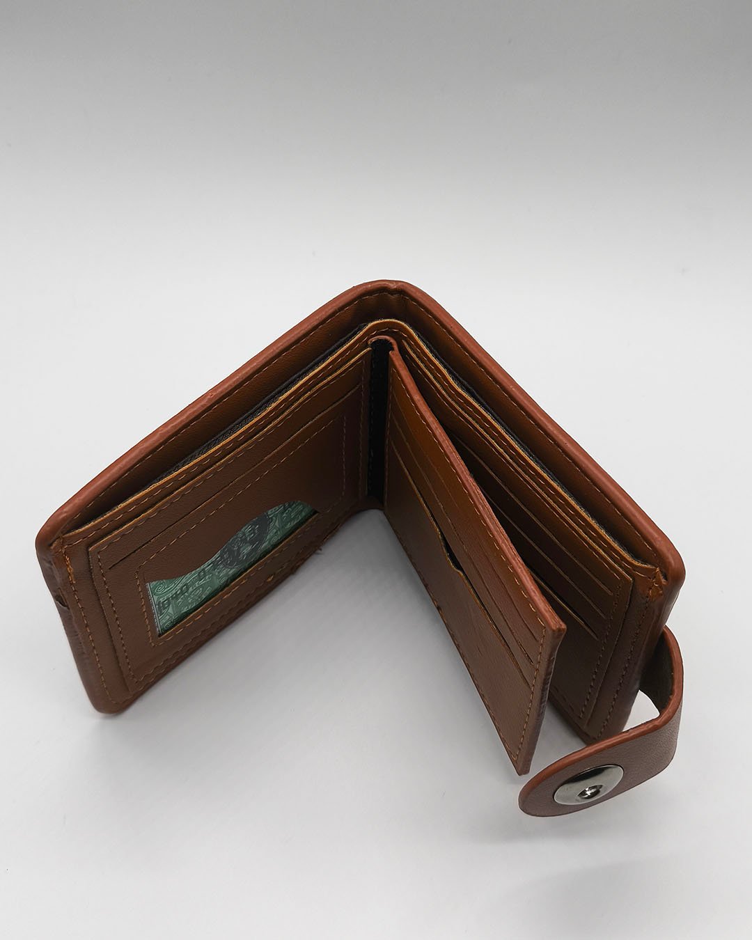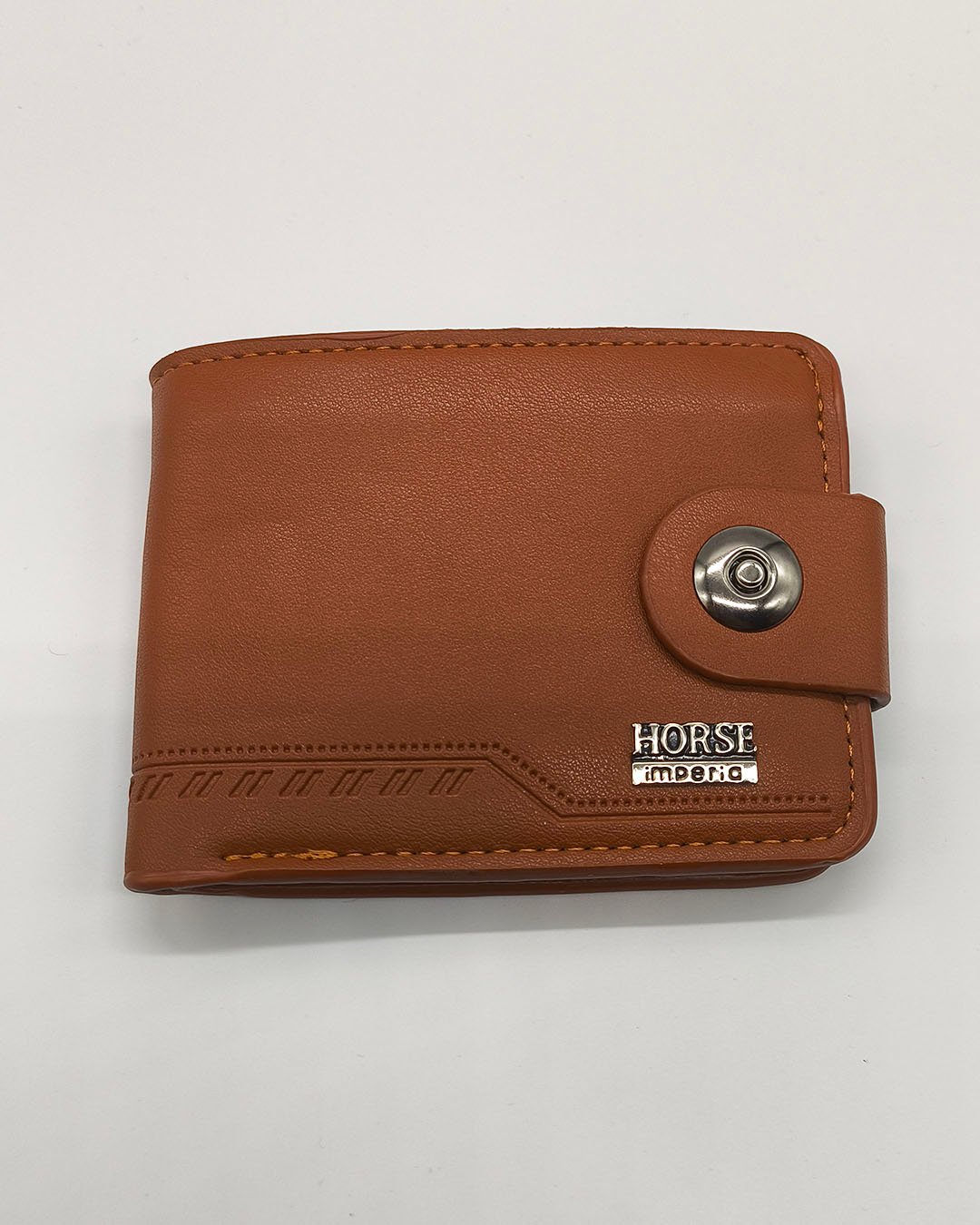 Billetera de cuero sintético HORSE, disponible en camel. Diseño moderno, con cierre metálico para mayor seguridad y múltiples compartimentos para tarjetas y billetes. Ideal para quien busca estilo y funcionalidad en su día a día.