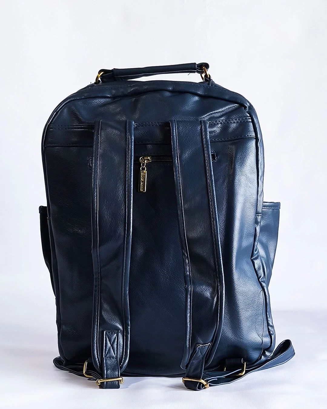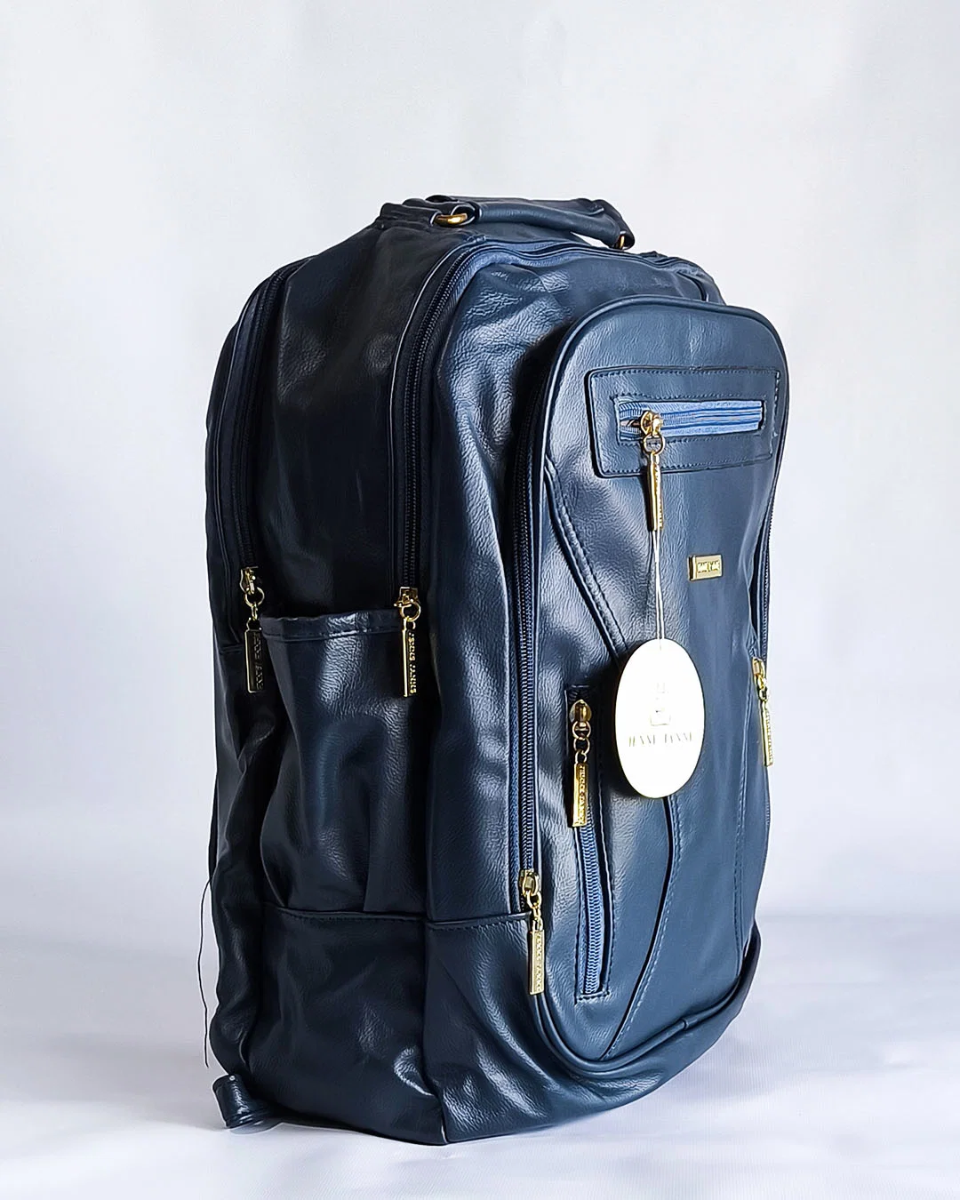 Mochila de cuero sintetico azul con detalles dorados, ideal para uso diario o viajes. Su diseño moderno y cómodo la hace perfecta para profesionales y estudiantes. Cuenta con doble compartimento principal con cierre reforzado, más múltiples bolsillos frontales con cierre que permiten organizar celular, billetera, llaves y otros objetos pequeños. Incorpora también bolsillos laterales ideales para botella o accesorios. En la parte trasera posee bolsillo con cierre para mayor seguridad. Sus tirantes son regulables y el asa superior reforzada facilita su traslado. Los herrajes y cierres metálicos aportan resistencia y un acabado prolijo.